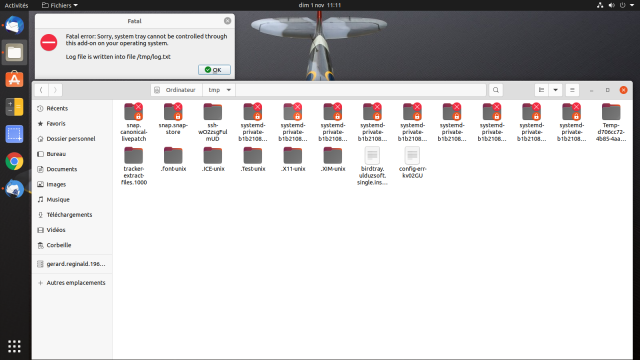 Thunderbird se lance sans aucun souci, mais Birdtray me génère une erreur, ou il me dit d'aller voir le log dans /tmp/log.txt .... hors il n'y a pas de log.txt, mais bien un fichier qui s’appelle "birdtray.ulduzsoft.single.instance.server.socket"