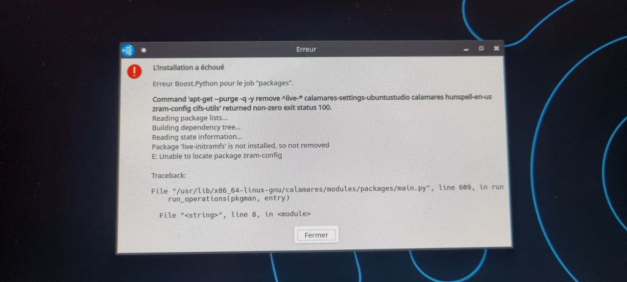 A l'installation automatique via clé usb j'ai le message d'erreur : Erreur Boost.Python pour le job "packages".